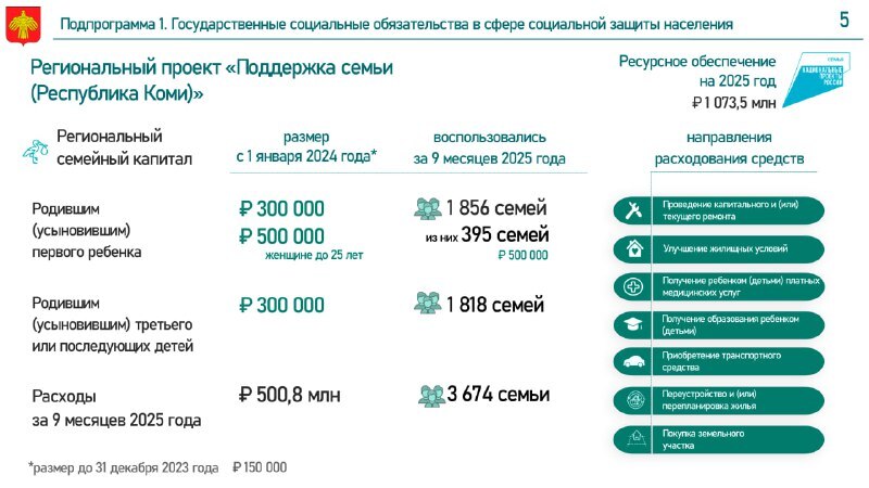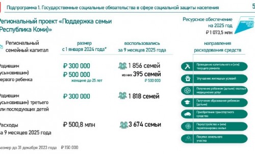 – Региональный семейный капитал является одним из значимых мероприятий регионального проекта «Поддержка семьи» национального проекта «Семья». Учитывая федеральный материнский капитал, семья сможет получить общую сумму поддержки до 1 млн 190 тысяч рублей, – отметила Татьяна Майкова. – Законодательство республики предусматривает достаточно широкий спектр направлений использования средств регионального семейного капитала. В настоящее время по поручению Главы Республики Коми прорабатывается вопрос о расширении возможностей расходования РСК. Дополнительно предлагается предусмотреть возможность тратить региональный капитал на возмещение расходов на образовательные услуги для детей с особенностями развития, в том числе услуги логопеда.